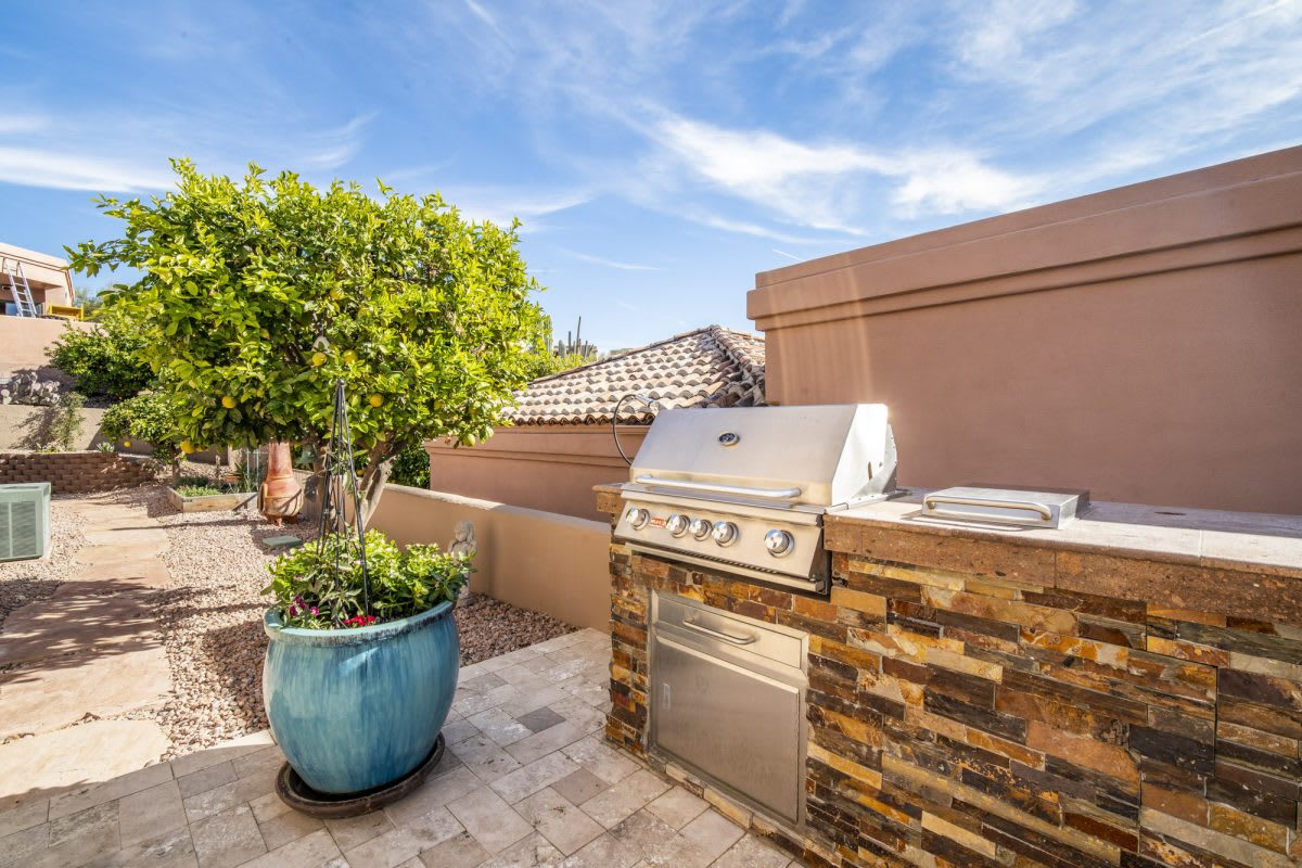 This home offers seamless indoor and outdoor living. Enjoy up-close views of the world-famous fountain and lake from your own patio, plus great mountain views. The large Travertine courtyard has fully automated awnings. The yard includes impeccable landscaping with charming retained planters, citrus trees, and a raised garden bed. Extend your outdoor entertaining with an outdoor Bull grill with stacked stone and Canterra finishes.