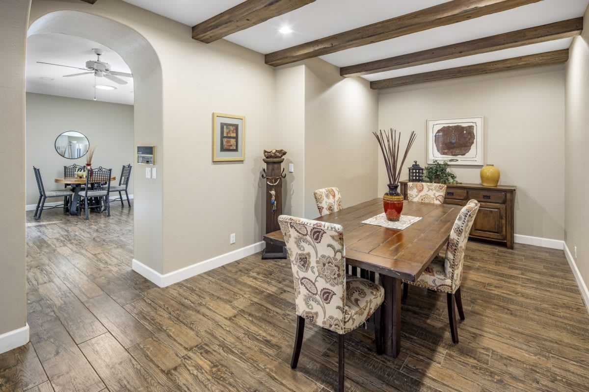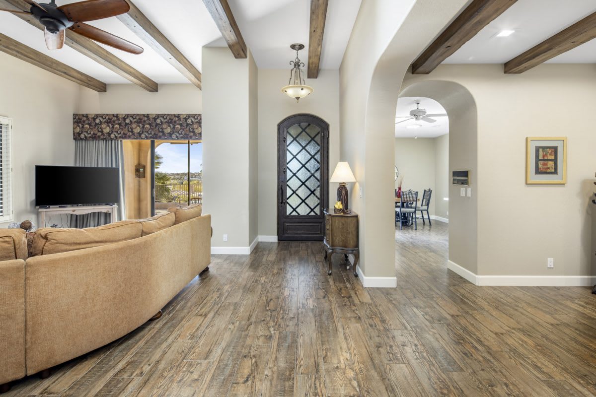 Step through the 9-foot custom iron door into a living space with 12-foot ceilings that feature 8”x8” beams. You’ll love the beautiful porcelain plank flooring and the upgraded 5-inch-tall baseboards throughout.