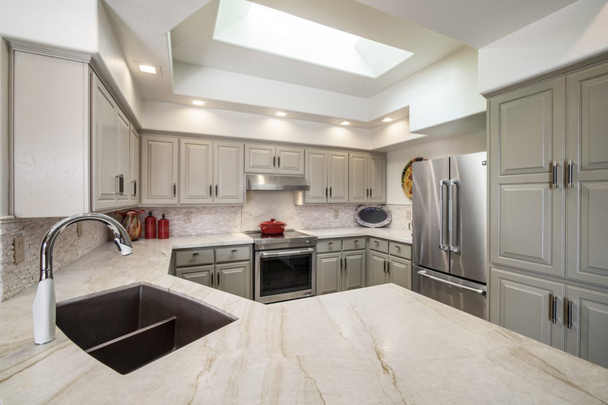 This kitchen has upgraded designer hardware, a Blanco sink, and a Brizo faucet. The new appliances are all stainless-steel Jenn Air, including an induction cooktop and Zephyr exhaust hood.
