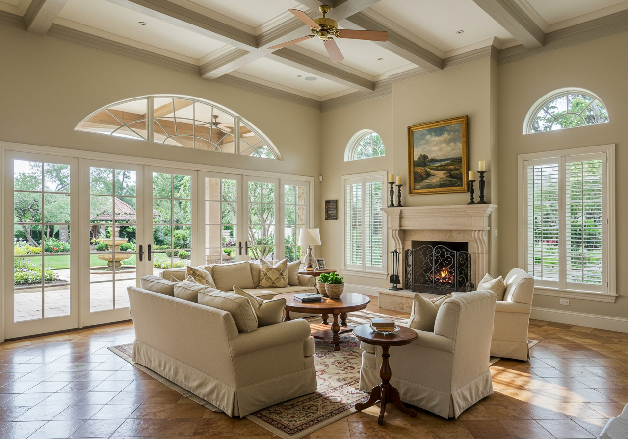 The large great room has space for a formal dining area. The wood-beamed, 12-foot ceilings offer a dramatic feel, along with walls of oversized windows with wood Plantation shutters. The porcelain tile in the living space gives it a clean, modern feel.