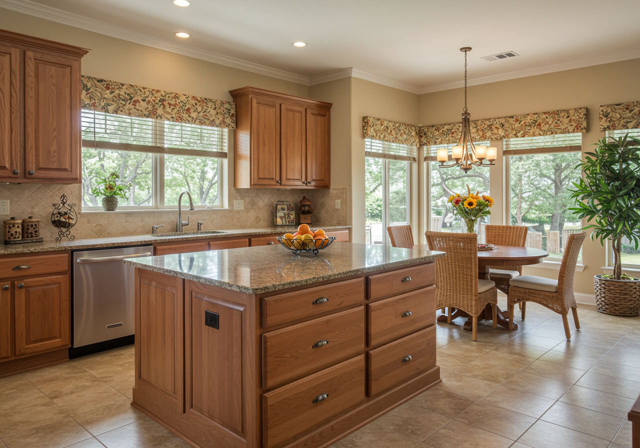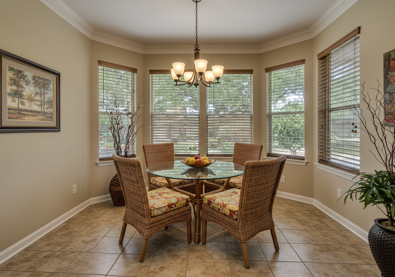 A granite peninsula in the kitchen has seating for three and is perfect for entertaining. The maple cabinetry, granite counters, and travertine backsplash make it warm and inviting. The huge dining nook has a large picture window for plenty of natural light. There is even a computer workstation nearby.