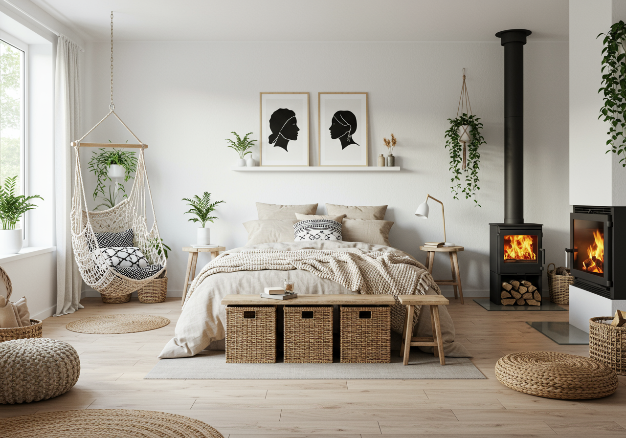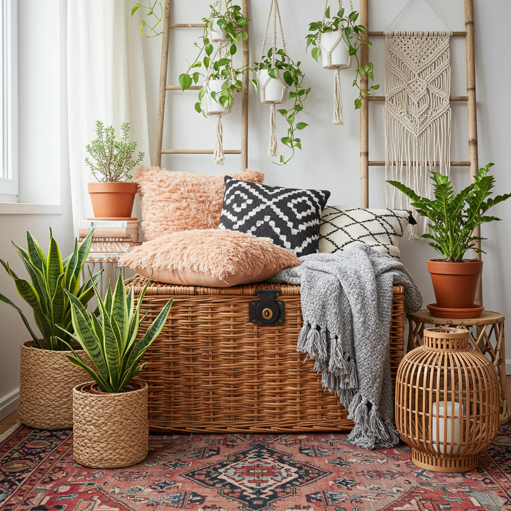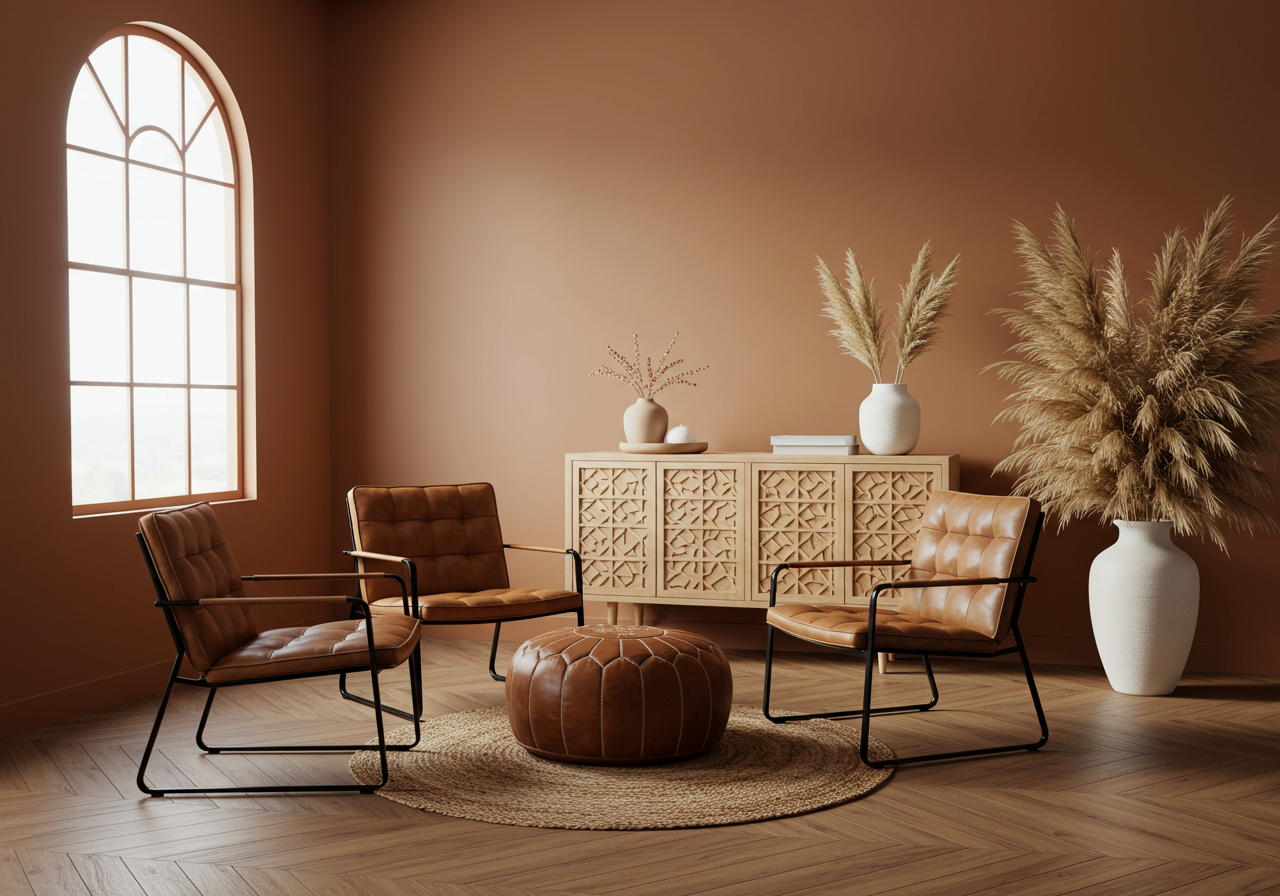 Add a variety of textures for a great sensory and visual feel. The modern Southwest design loves rattan, wicker, macrame, ceramic, woven fabrics, and leather. Leather gives a nod to the Old West but choose modern designs in cognac instead of dark browns.