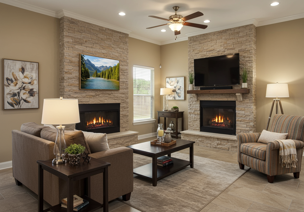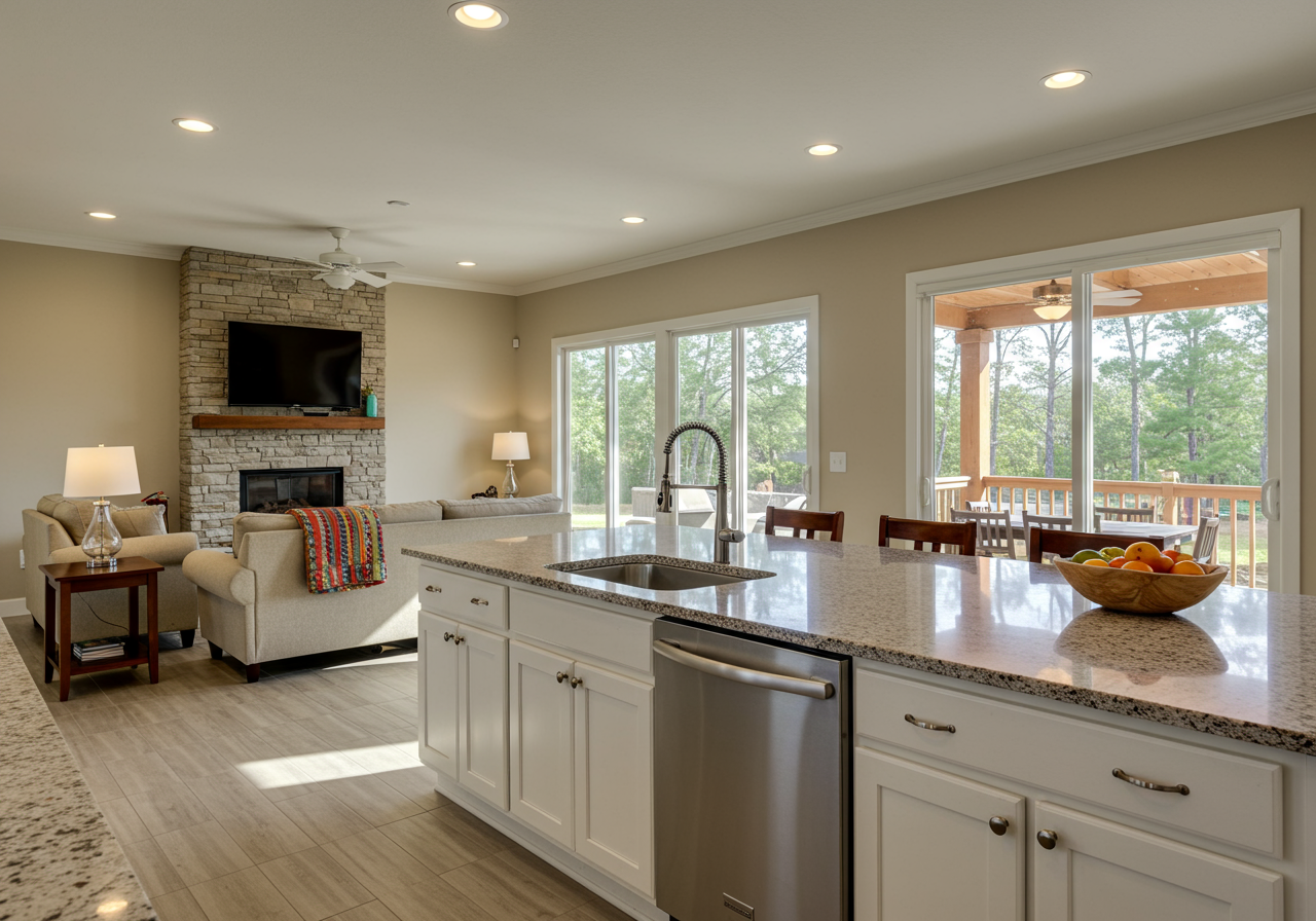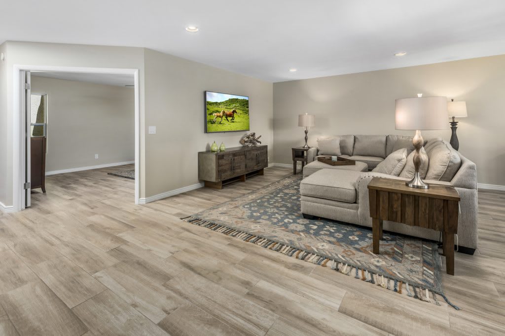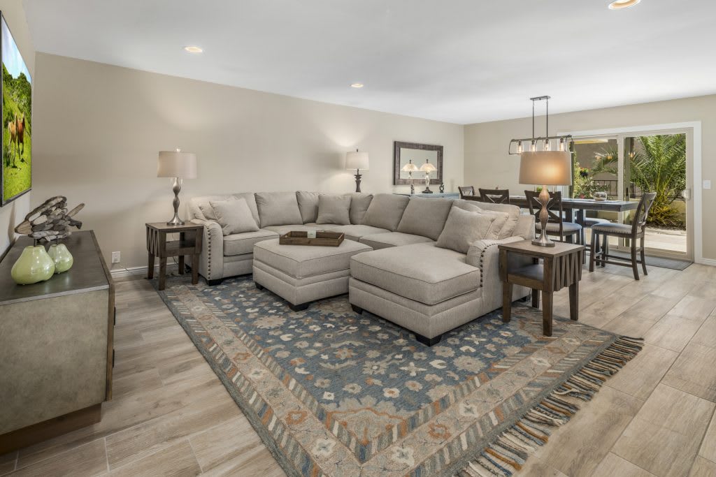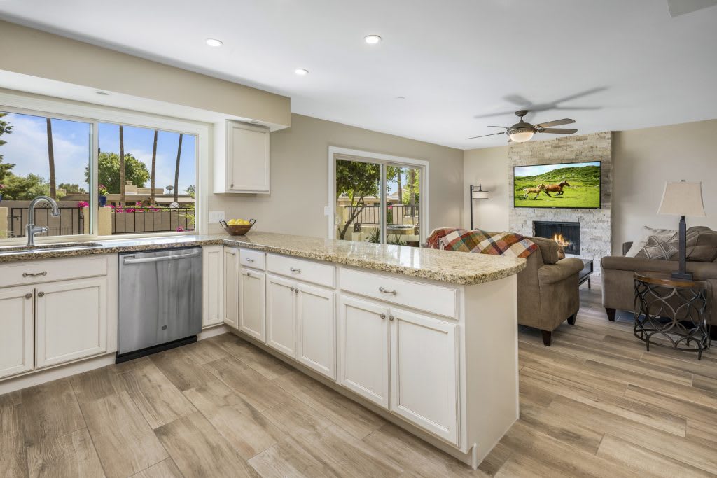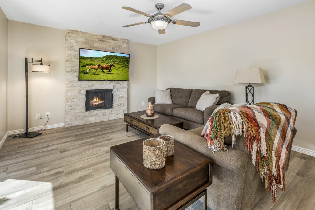 The home has been gorgeously updated with a Southwest casual style. It is the perfect open concept living with wood-style plank flooring, a fireplace with a stacked stone surround, and easy access to outdoor spaces.