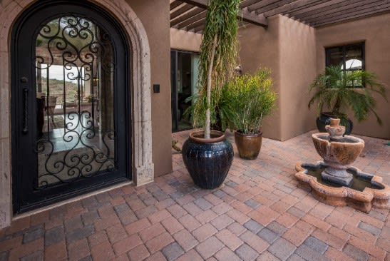 You’ll start by entering a charming courtyard with a fountain and a beautiful iron entry door.