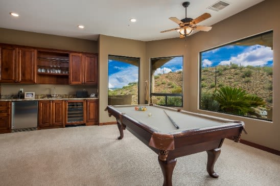 If you are looking for a home where you can offer a high level of hospitality, this home has a lower-level game room with a TV, billiard table, and a wet bar with a bar fridge and wine captain.