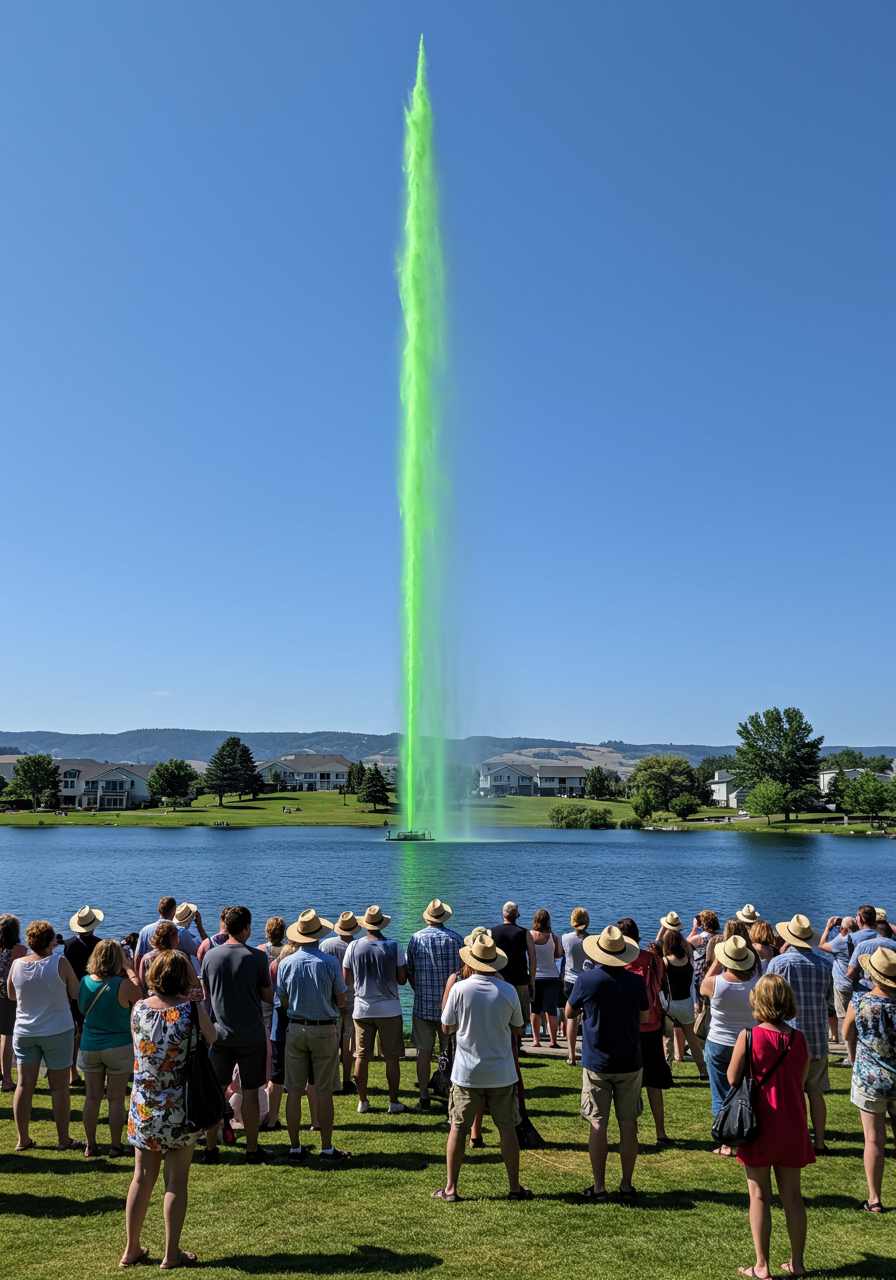 As the clock struck noon, the fountain turned green as always. There was a slight delay due to a breeze appearing out of nowhere, but soon enough the pillar of green water towered high into the sky.