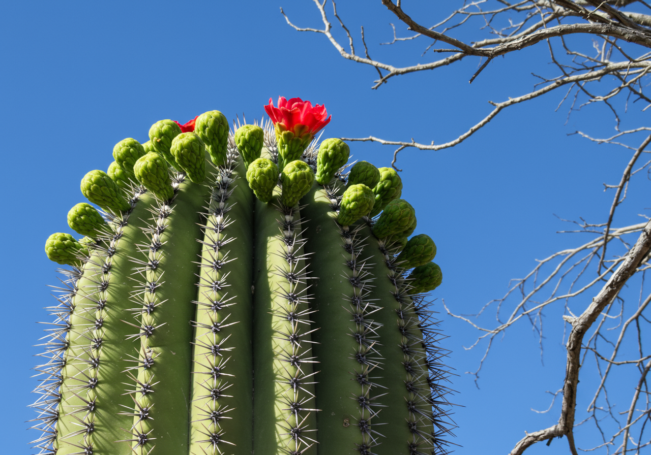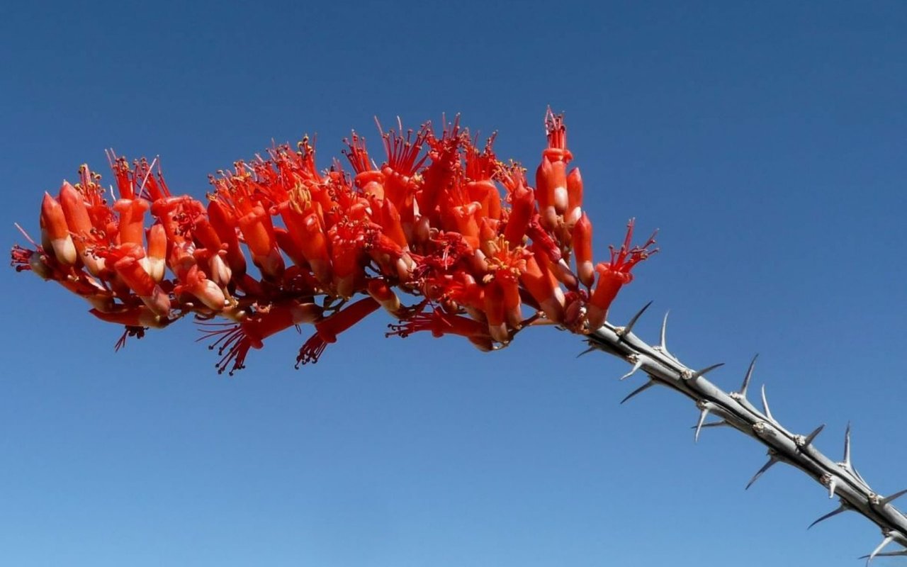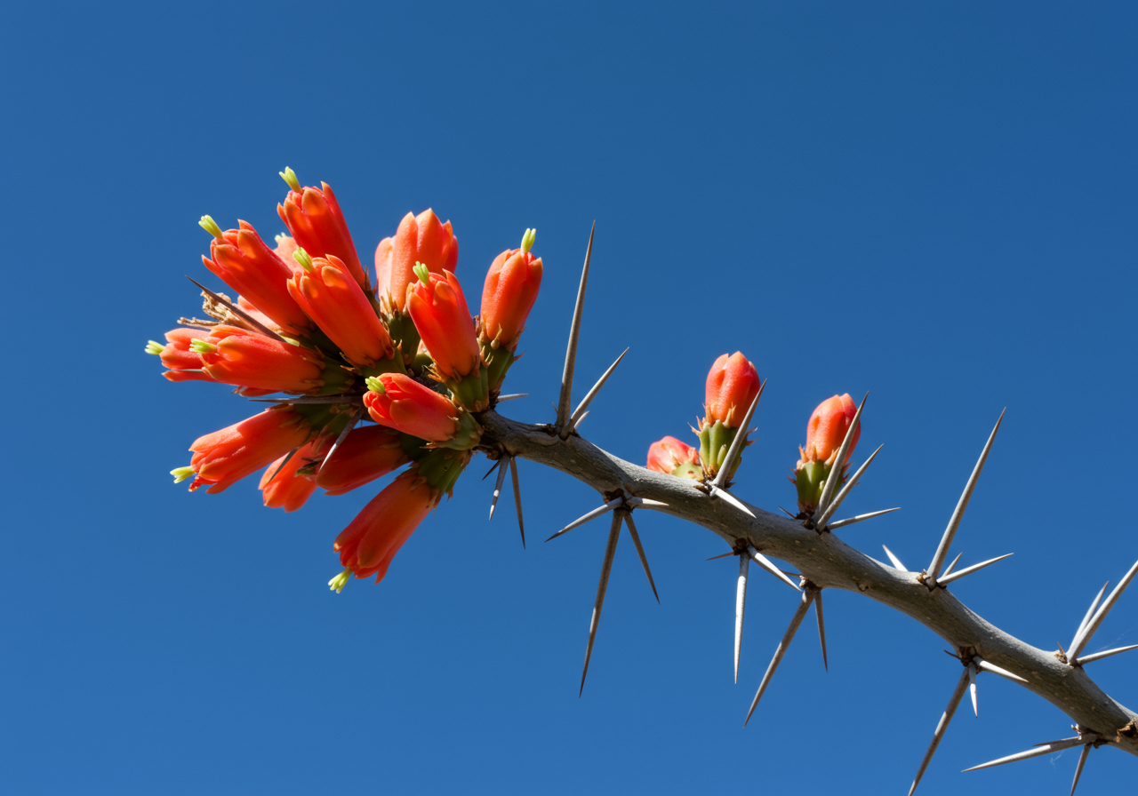Ocotillos, contrary to popular belief, are not cacti, but rather drought-deciduous bushes endemic to the American southwest and Mexico. After significant rains, ocotillos often become covered in small leaves, which taste like spinach when consumed. Every spring, ocotillos bloom brilliantly with bright red flower stalks at the top of each branch. These flowers can also be harvested, and taste quite sweet.