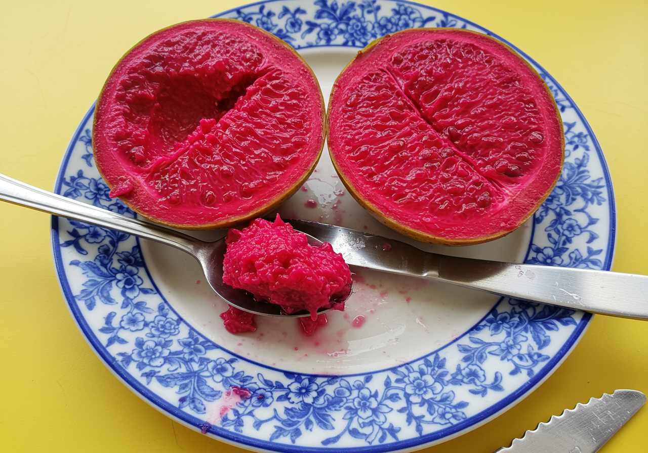 This prickly pear was prepared by putting a lighter to its thorns and then splitting it in half with a knife, scooping out the contents with a spoon.