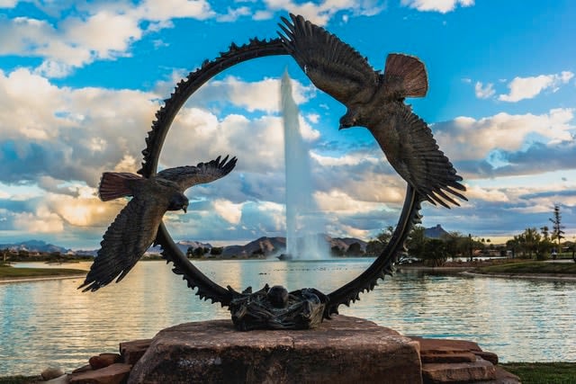 If you’re strolling through Fountain Hills and want more than just scenic views, keep an eye out for our public art. There are over 150 sculptures, paintings, and fountains along Avenue of the Fountains, Fountain Park, and Centennial Circle. Inside the Community Center and Public Library, you’ll find even more, from bronzes to murals, creating a diverse art collection.