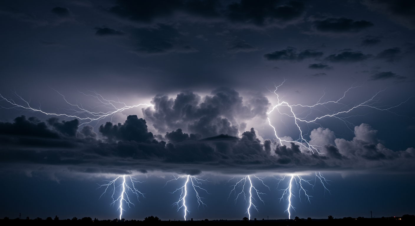 Lightning thunderstorm flash over the night sky. Concept on topic weather, cataclysms (hurricane, Typhoon, tornado, storm)