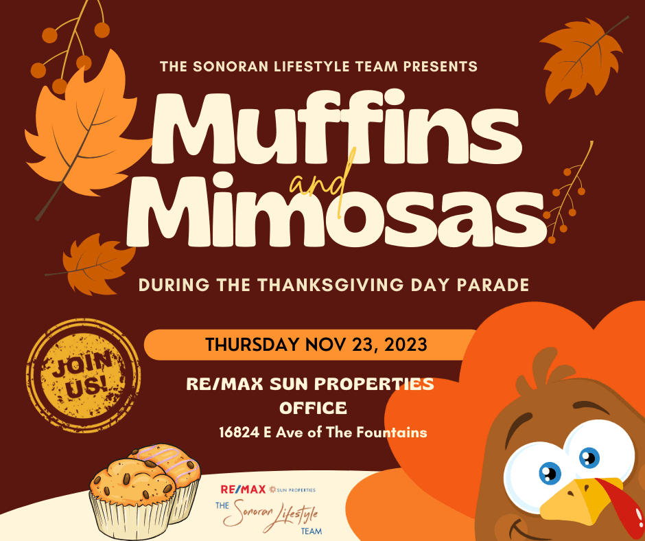 During the Thanksgiving Day Parade, we invite you to join us for the Muffins and Mimosas gathering at REMAX Sun Properties office, located at 16824 E Avenue of The Fountains. Bring your comfortable lawn chairs and enjoy the parade as it passes by. We’ll be serving sparkling mimosas, steaming hot coffee, and offering a selection of fresh muffins and delectable baked goods for your enjoyment.
