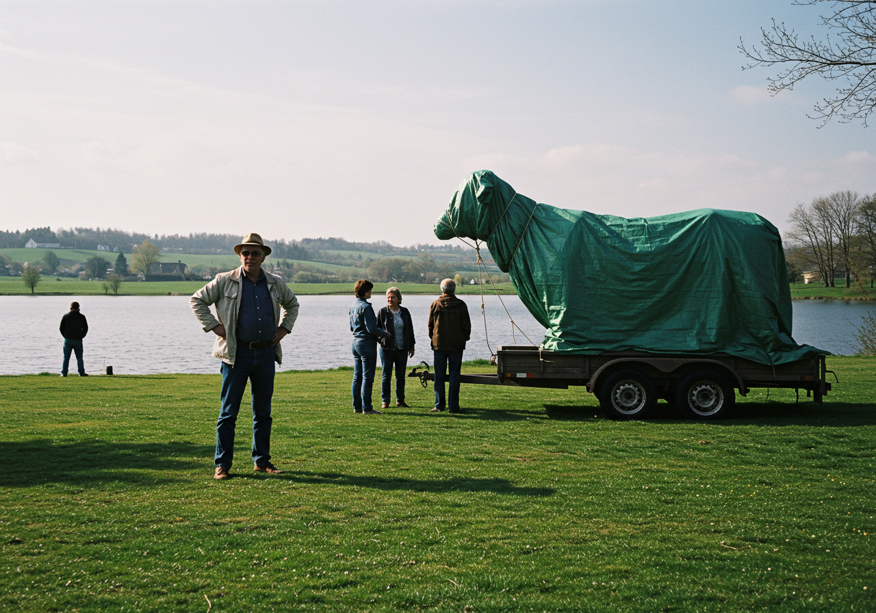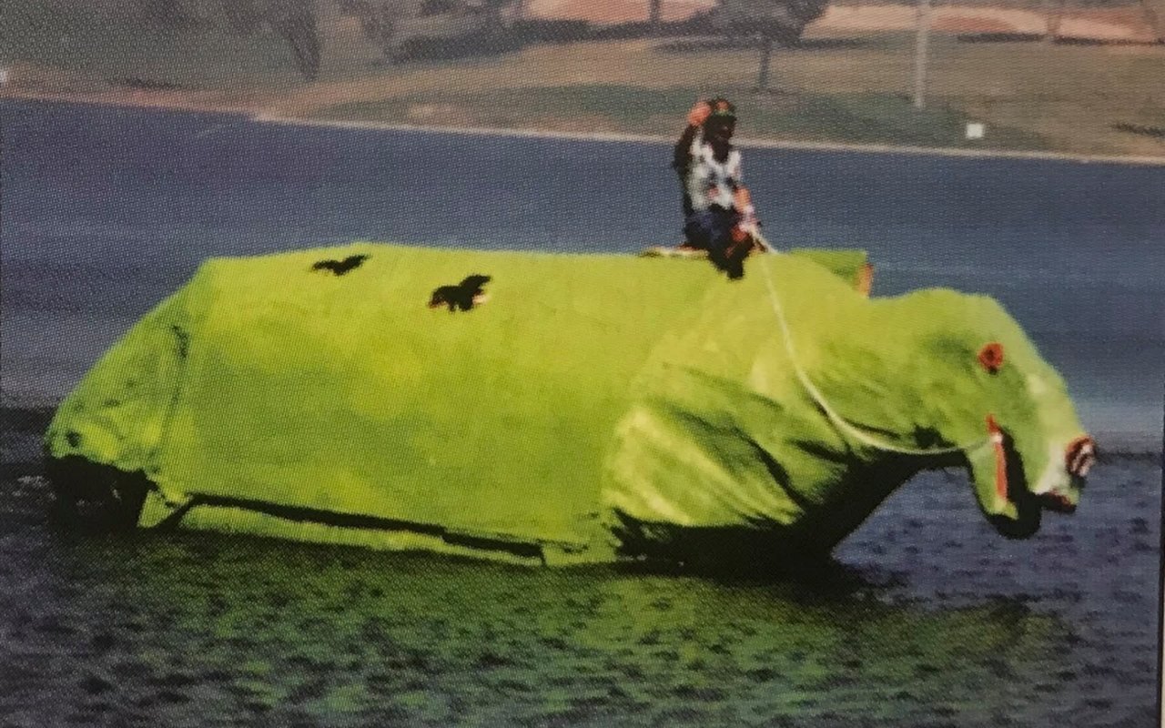 To create the illusion that Nessie only appeared for a special visit on St. Patrick’s Day each year, templates of large footprints were made in Dick Sear’s cabinet shop and a green water-soluble paint was sprayed on Saguaro Boulevard using the templates to create a trail of footprints showing how Nessie came and left Fountain Park. The propellant to apply the paint was propane vapor, and it adhered to the asphalt so well that Pat Harvey of the Road District approached Terry Gill to find out what was used as it lasted longer than the striping paint normally used by the district.