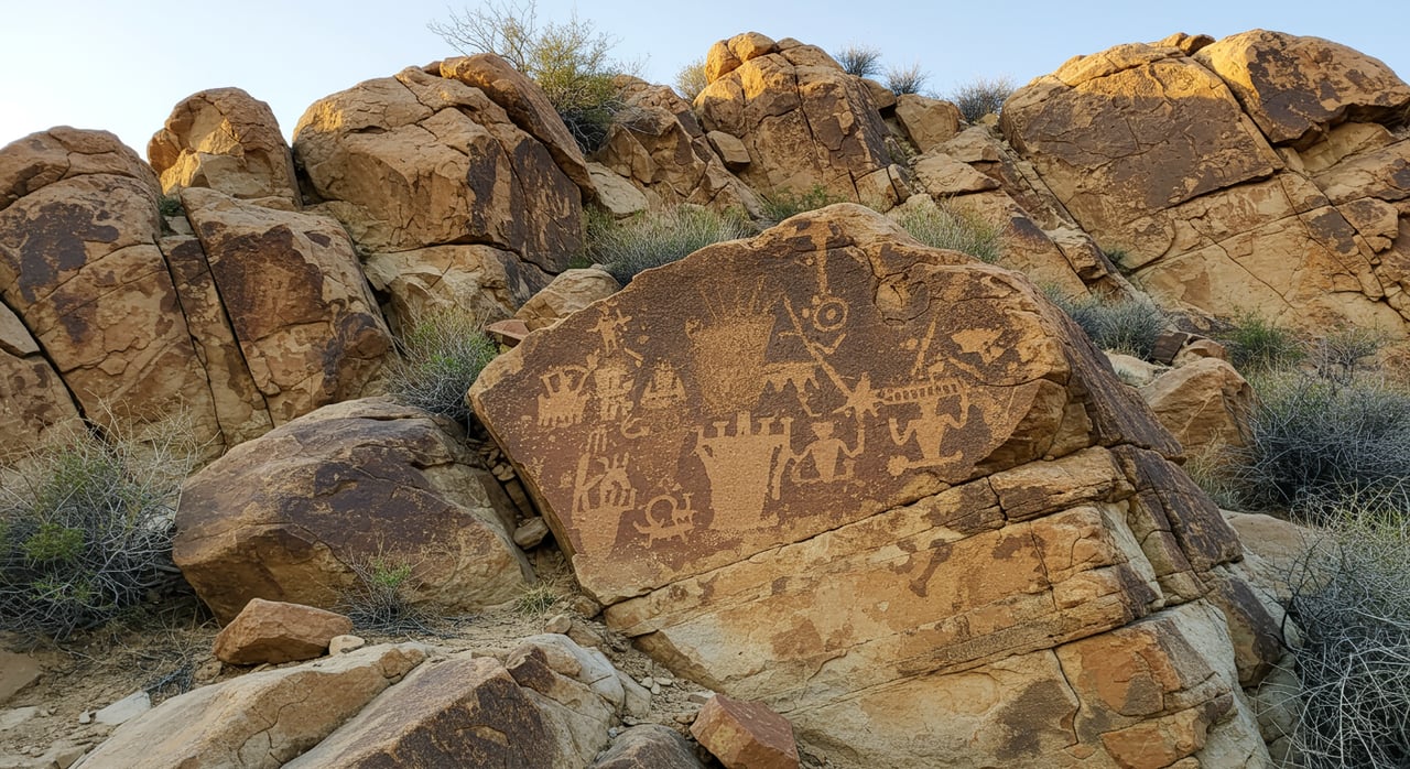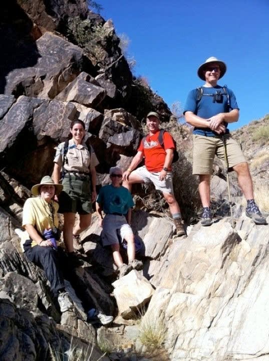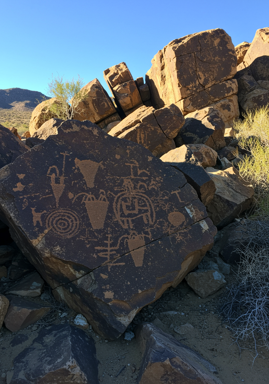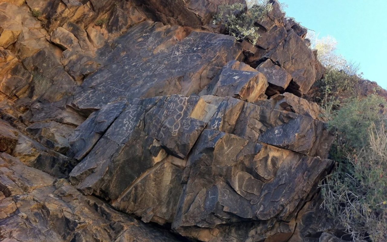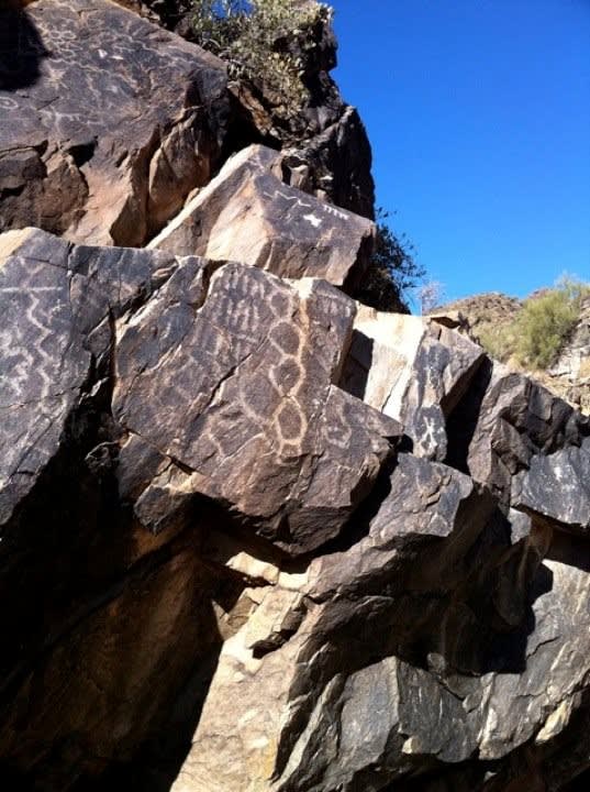 Continue up the wash another 100 feet to find rock petroglyphs from three different time periods. The Archaic petroglyphs of unrecognizable shapes date back about 800 years. The Hohokam petroglyphs from a later time are recognizable as stick figures representing animals, human forms, sunbursts, and water.