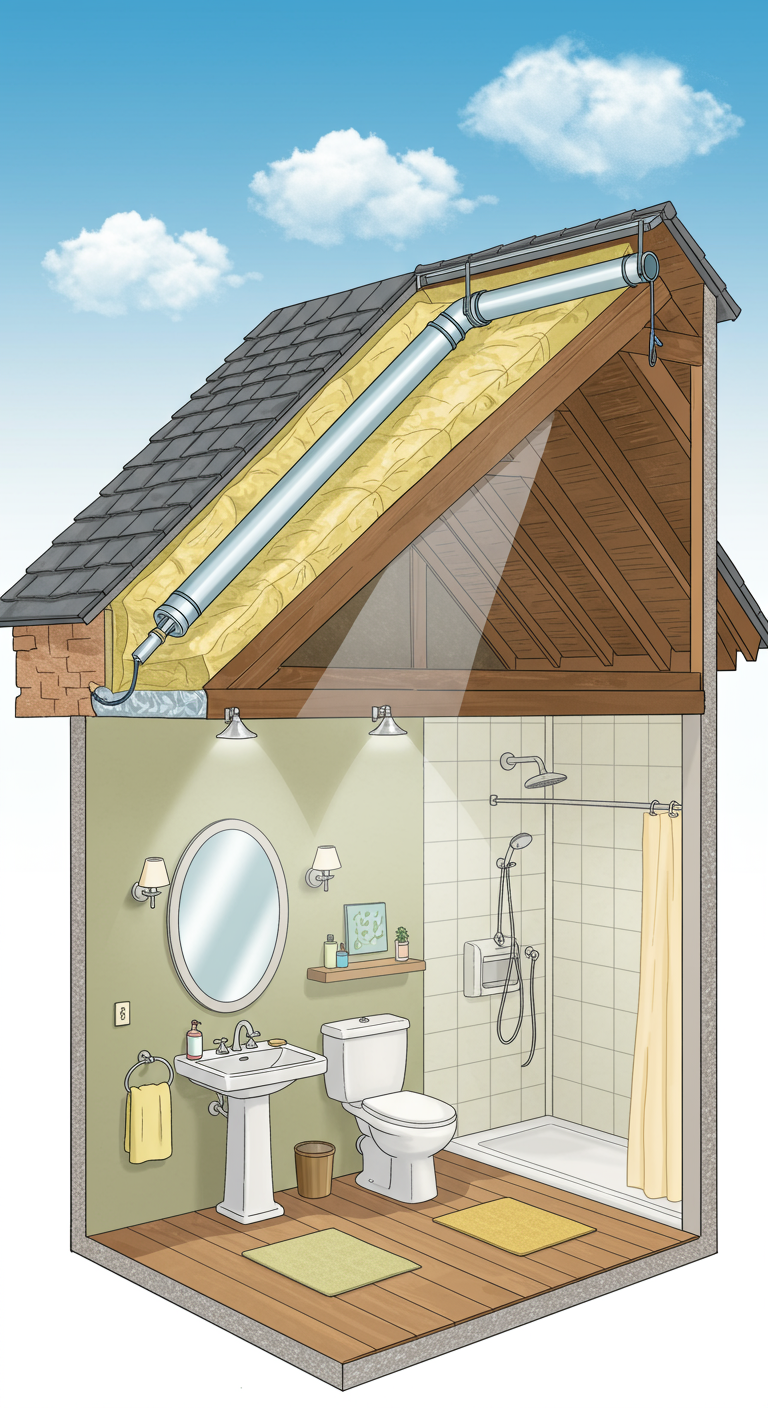 A waterproof plastic globe covers a solar tube on your roof. The tube terminates in a diffuser that resembles a porthole in the ceiling of a room below. The diffuser spreads the light in a bright, clean white glow after the globe collects light from the outside. The result is dramatic: People who have new installations frequently reach for the light switch as they leave a room.