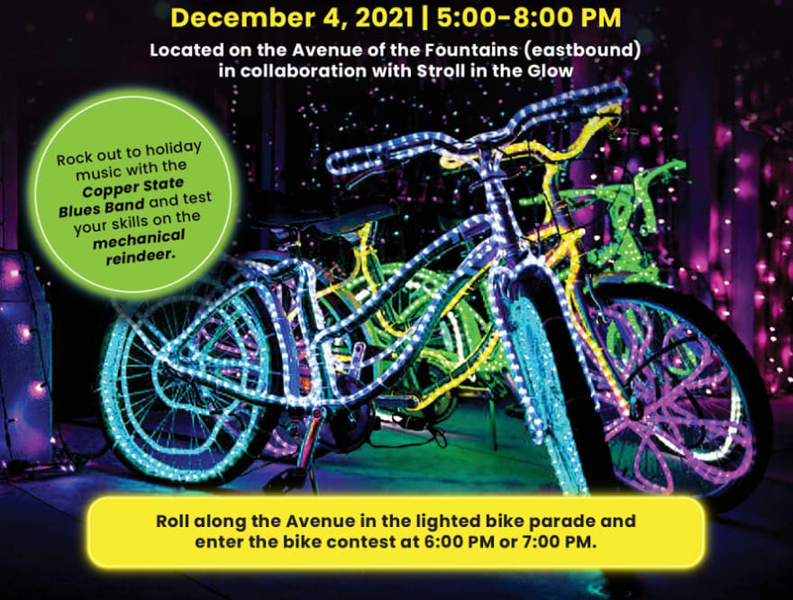 Stroll in the Glow comes with a special twist this year. The eastbound lane of the Avenue will be partitioned off for bikes in the first-ever “Roll in the Glow!” Decorate your bicycles with lights and parade them down the Avenue. A bike decoration contest will begin at 6:00 PM. Be sure to really deck your bikes like you’re decking the halls.