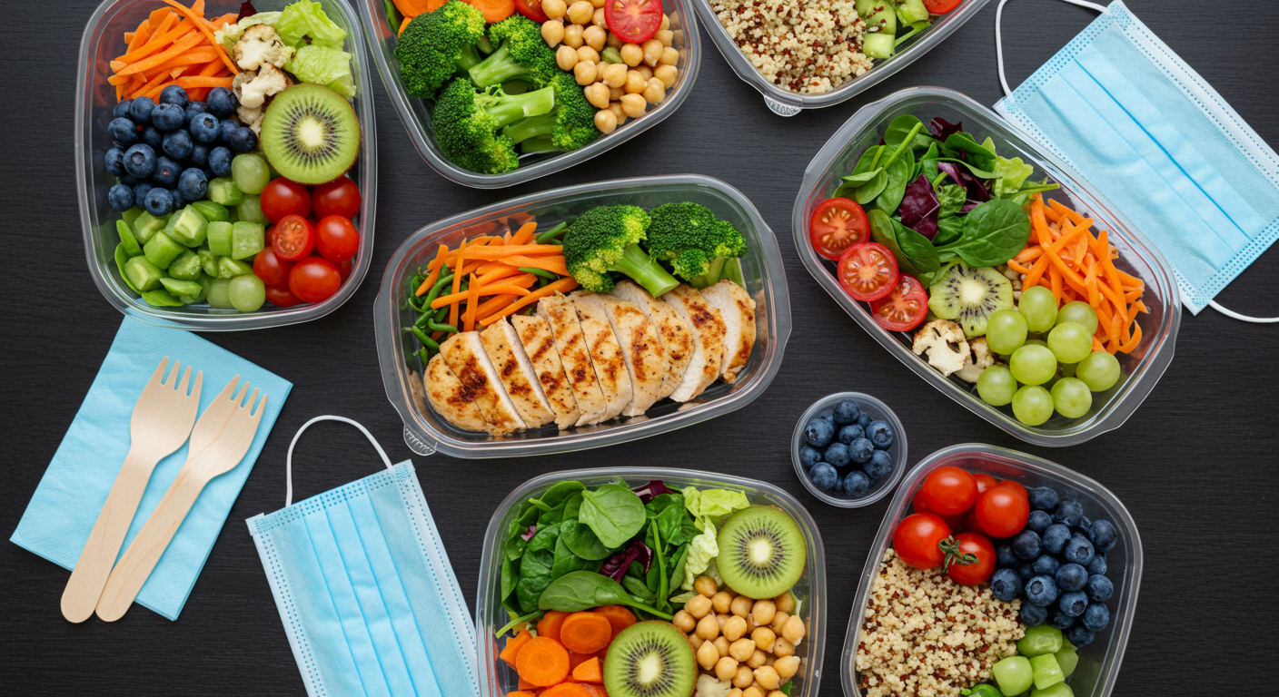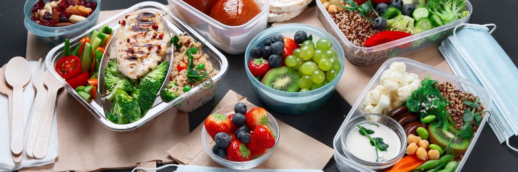 Takeaway lunch boxes with homemade nutrition food – meat, vegetables and fruits. Panorama, banner