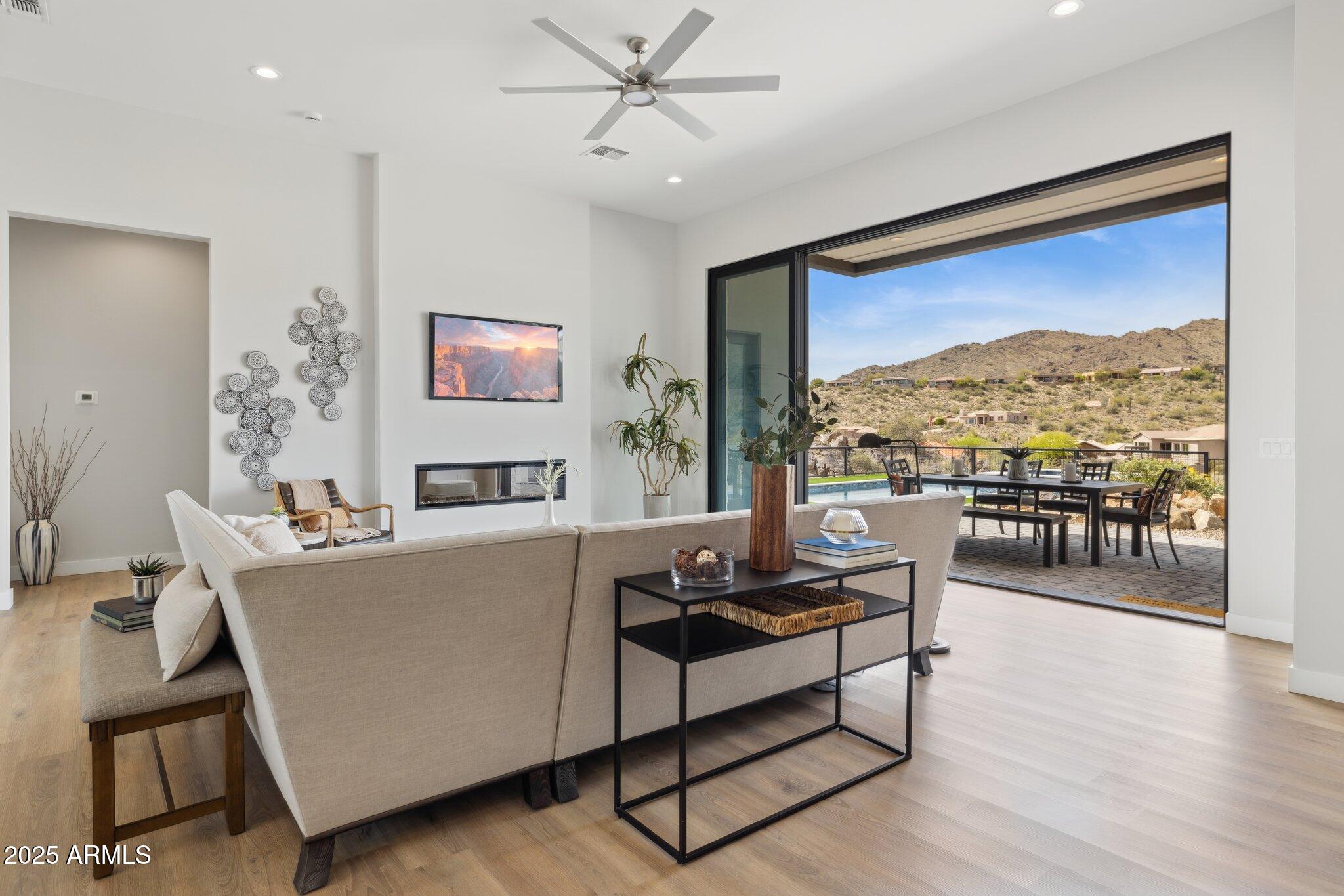 New home by Harr Family Homes, pool, spa and large fenced yard! Contemporary Southwest home on .86-acre with big views of McDowell Mountains, Fountain & Superstitions. Backs to stunning boulder arroyo for privacy. Enjoy open, view-oriented plan featuring 16' X 10' stacking doors that lead to outdoors from a stunning Great Room w/60'' fireplace and 8' interior doors. 10' island kitchen in Kitchen offers Shaker style cabinetry, 66'' uppers to 10'ceiling, SS Frigidaire Pro Series appliances w/full size Refrigerator & Freezer plus 138-bottle wine captain. There is a large Den + 3 fully suited bedrooms. The primary suite features W/I shower, beautiful tub & a 9x13' w/i closet w/ custom shelving. Large 4-car garage w/10' ceilings!