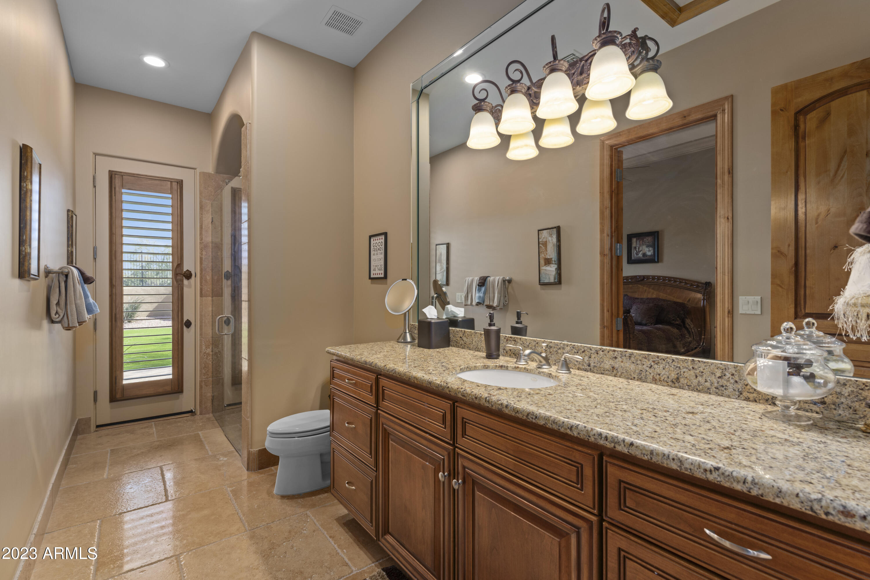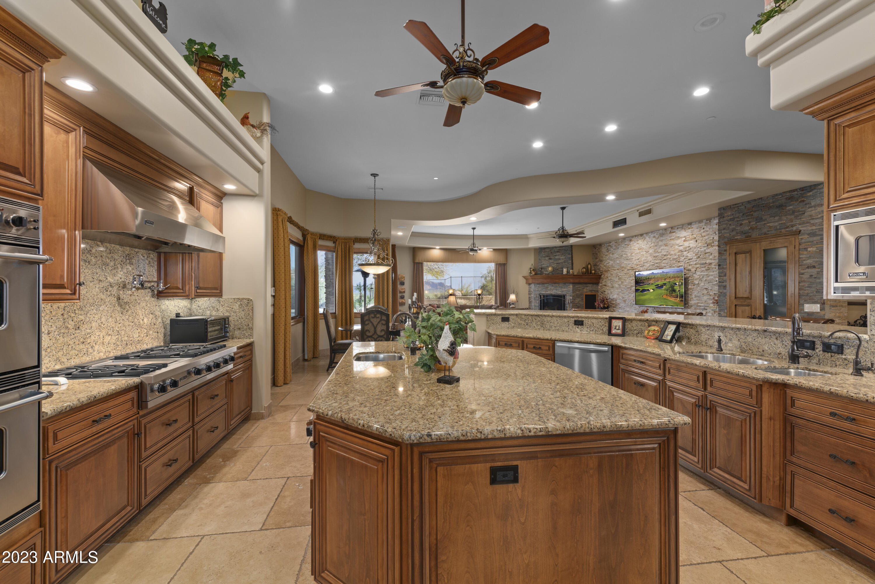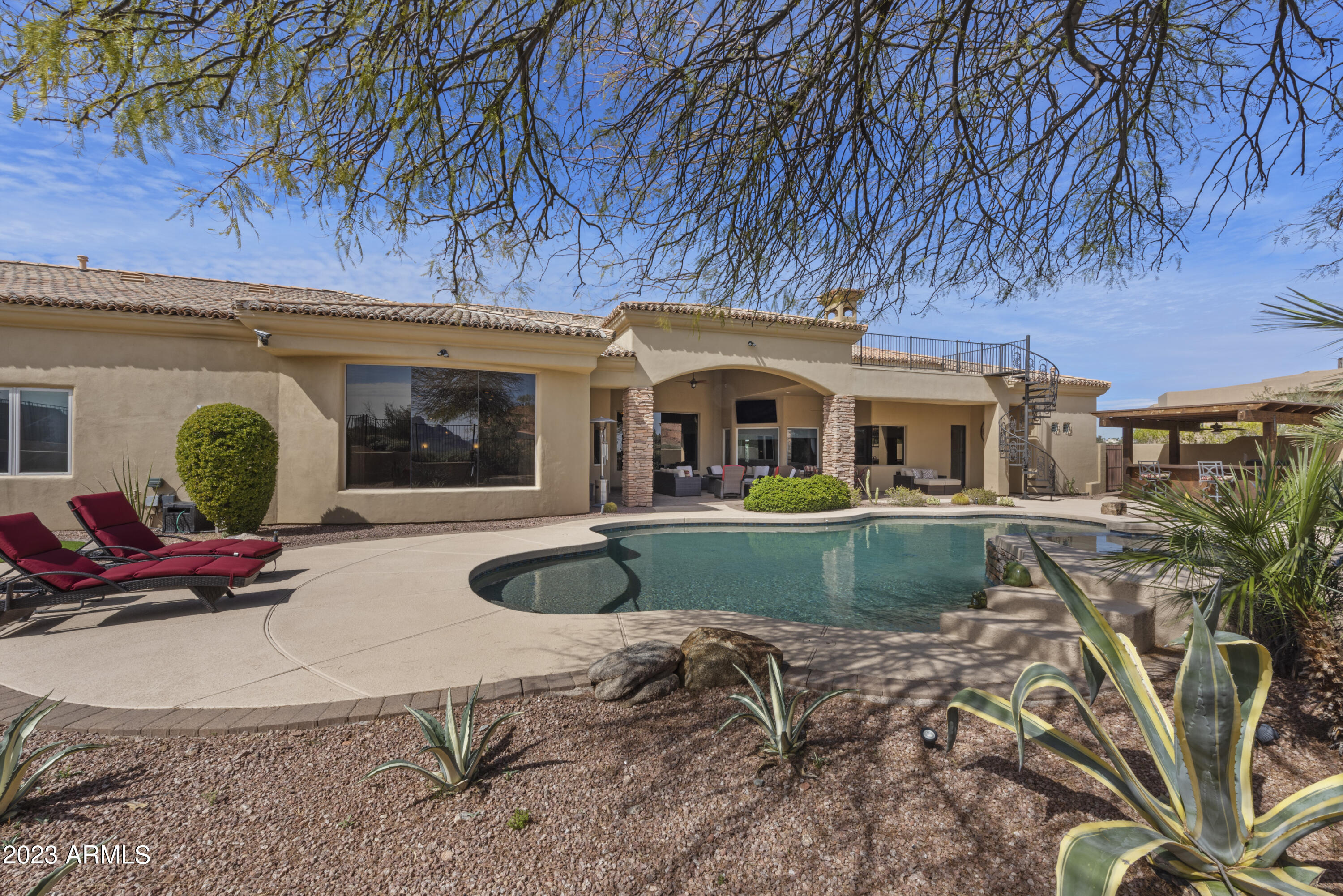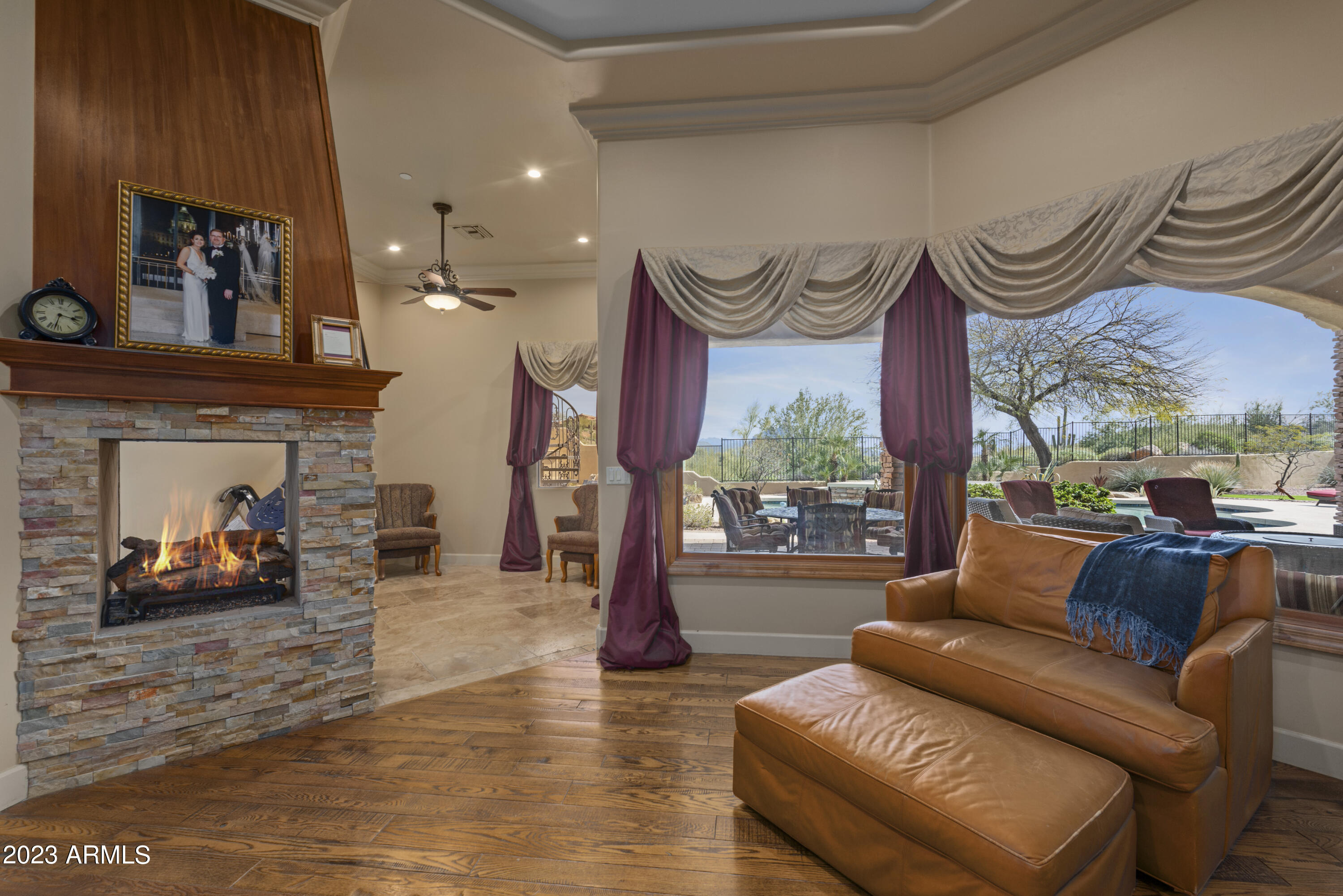 As a polished FireRock Country Club gem, this estate incorporates both luxury and functionality seamlessly. Rare to its peers, the single-level floor plan awaits, with coveted views of Red Mountain beyond the step-free backyard. Make entertaining an event with a formal living room, formal dining room, and open-concept kitchen looking over the massive family room with its own fireplace and full wet bar. Artfully spaced from the four en-suite bedrooms; an office and spacious media room are well thought out and feature their own half bathrooms. Step inside and arrive to the finest view of Red Mountain, soaring ceilings, exquisite finishes, and travertine flooring throughout. Just beyond the foyer, you will find a luscious formal living room, perfectly framing your desert oasis, and exceptional mountain views. As you make your way through the home, take notice of the gorgeous den/guest room, which provides plenty of natural light, plantation shutters, a half bathroom, and stunning hardwood floors. Designed for versatility, the gourmet chef's kitchen offers top-of-the-line stainless steel appliances, oversized granite countertops, a spacious pantry, 6-burner gas range stove, double ovens, pot filler, and the opportunity to create delectable delights each and every day! Open to the kitchen is the intelligently situated family room, which offers a gas fireplace with stone details, walls of windows with new window treatments, vaulted ceilings and endless mountain views. Conveniently located off the kitchen and family room, you will find an expansive wet bar waiting for your next cocktail to be shaken and served! End each day with tranquility in the master retreat, which embodies luxurious serenity. As you approach the master suite, you will find a wall of windows perfectly framing the beauty of the Sonoran landscape, hardwood floors, two-way gas fireplace, custom closets, spacious enough for any wardrobe, vaulted ceilings, and a personal seating area or study to ensure privacy and a peaceful environment. The master en-suite is complete with separate vanities, his and hers water closets, more intricate stone finishes, a pedestal soaking tub, and an oversized walk-in shower. Each of the additional four bedrooms offers ample space, storage, and a private en-suite. Host your next sporting event in the game room designed with hardwood floors, built-in cabinets, top-of-the-line wine refrigerator, additional beverage cooler, personal half bathroom, and private outdoor access. Equally impressive is the massive 4-car garage with room for 4 lifts, new interior and exterior paint, updated exterior and interior lighting fixtures, recently epoxied garage floor, and much more! Treat yourself by spending a few extra moments in the captivating backyard, which embodies desert living by offering a heated pool, spa, covered BBQ with bar seating, a spacious covered patio, and a viewing deck that offers the opportunity to appreciate the rarity of unparalleled Sonoran living.